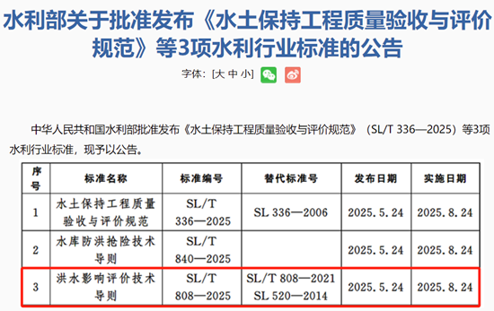 近日,公司參編水利行業標準《洪水影響評價技術導則》(SL/T 808—2025)(中華人民共和國水利部公告2025第12號)正式發布,將于2025年8月24日起實施。