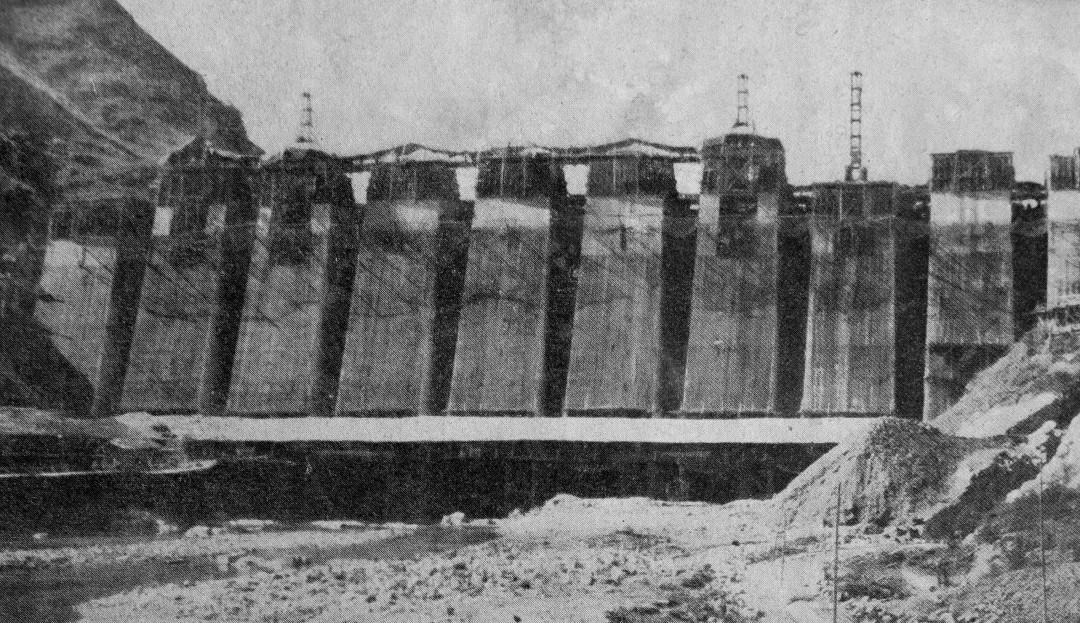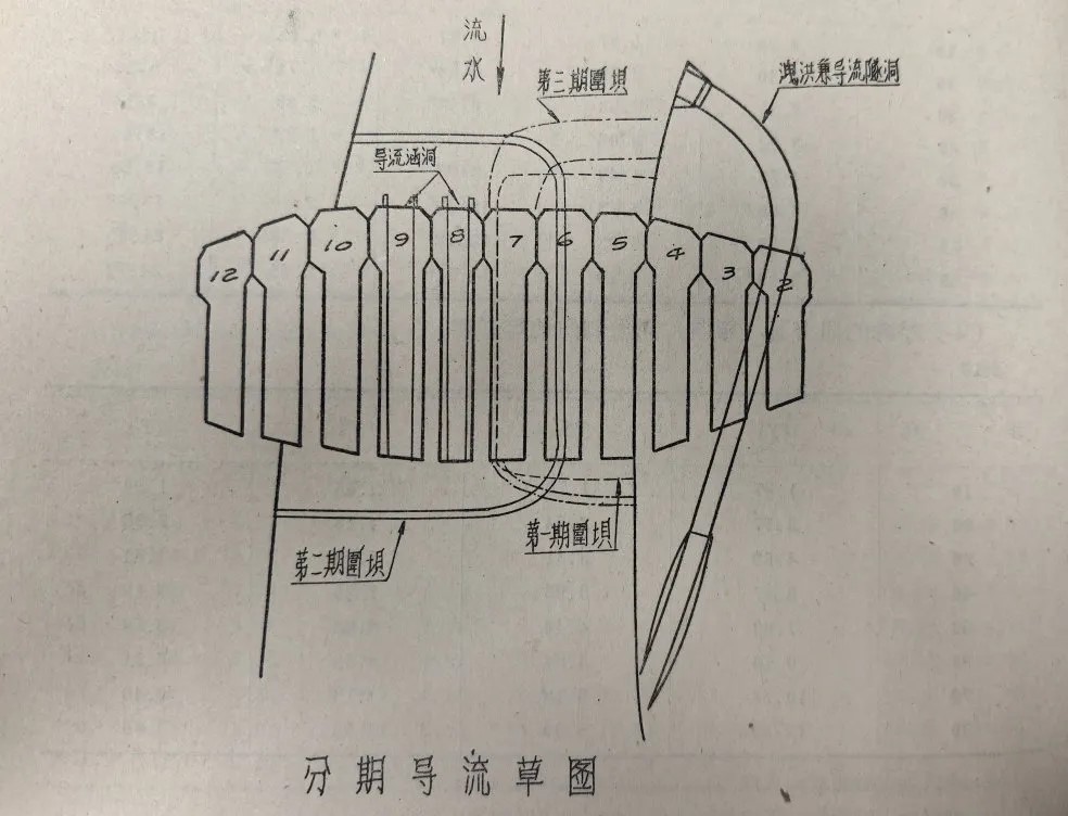 完成前期的關(guān)鍵準(zhǔn)備工作,1956年9月工程開工建設(shè),由治淮委員會勘測設(shè)計院組建磨子潭水庫工程指揮部負責(zé)施工。由于水庫位于大別山區(qū)淠河上游,地形上為峽谷,河床寬度僅有90米,且兩岸山坡陡峻,坡度在1:1至1:1.4之間,并有局部陡壁存在,因此清基爆炸數(shù)量大。按原定計劃,大壩開工前應(yīng)當(dāng)鑿?fù)ㄐ购樗矶醋鳛榇髩问┕て陂g導(dǎo)流之用,上下游做好圍壩,進行基礎(chǔ)開挖,然后再澆筑大壩混凝土。泄洪隧洞于1956年9月中旬開挖,而大壩要求1957年汛期就要起到攔洪作用,因此磨子潭水庫施工期限十分短促。為及時完成要求,磨子潭水庫工程指揮部結(jié)合當(dāng)?shù)氐牡刭|(zhì)特點等,采用了分三期導(dǎo)流、分區(qū)爆炸、分區(qū)澆筑混凝土的方案,成功完成了約33萬立方米的混凝土澆筑。