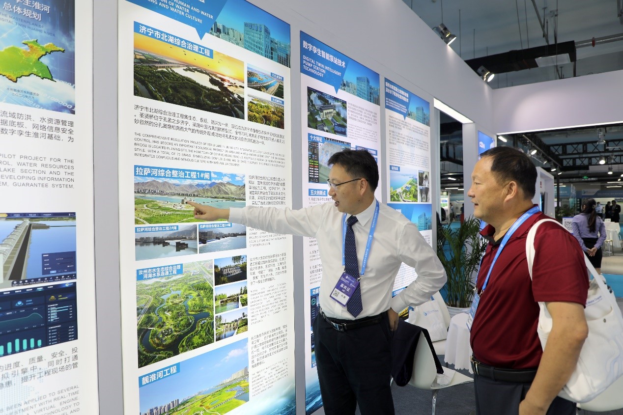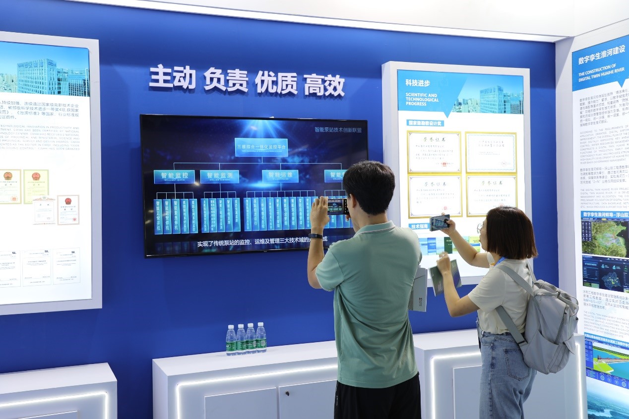 公司在A展廳設(shè)置展區(qū),圍繞國家治淮重點(diǎn)工程、國家骨干水網(wǎng)工程、科技進(jìn)步、人水和諧-水工程與水文化的交融、數(shù)字孿生淮河建設(shè)、數(shù)字孿生智能泵站技術(shù)、板橋水庫混凝土壩壩體滲漏深水水下防滲處理關(guān)鍵技術(shù)及灌注樁-粉噴樁混合式樁基技術(shù)等八大主題設(shè)置展板。